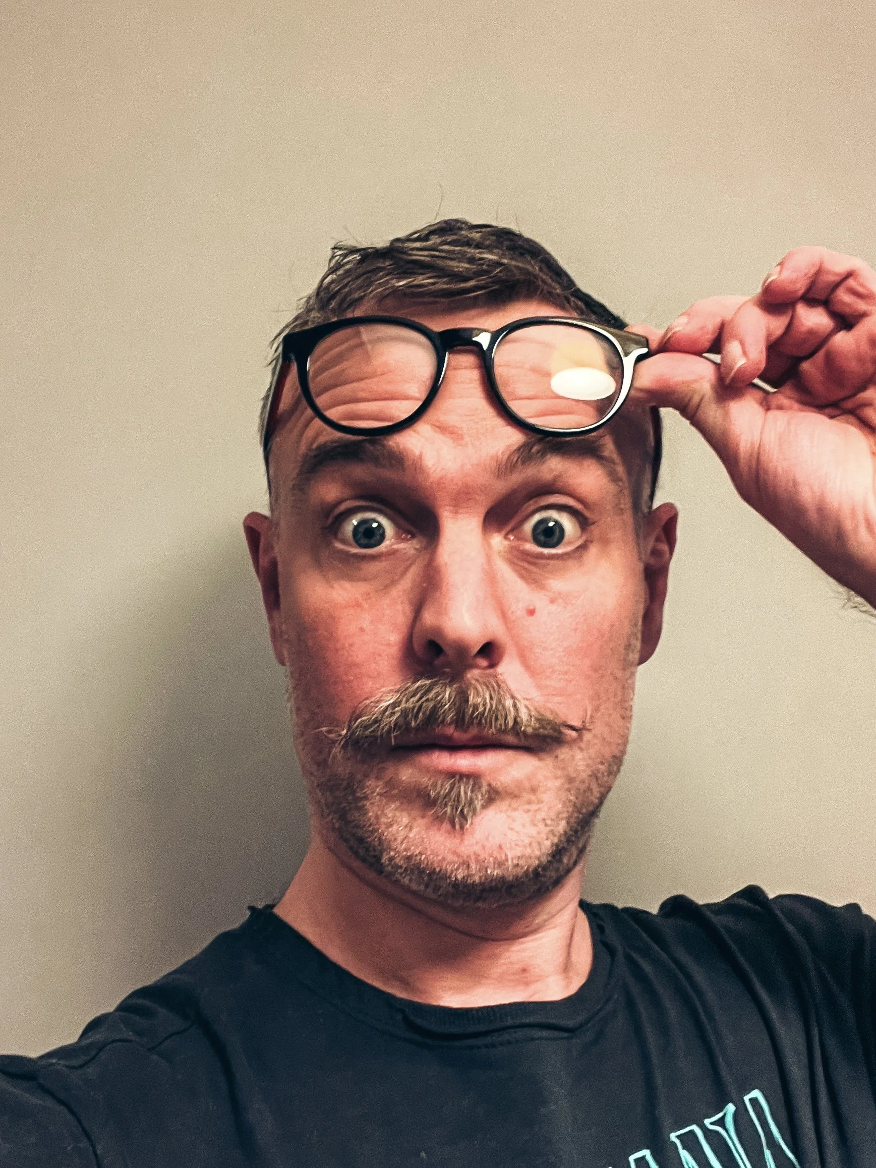 A man with a mustache and beard, holding a pair of glasses on his forehead, looking surprised or curious against a plain wall background.